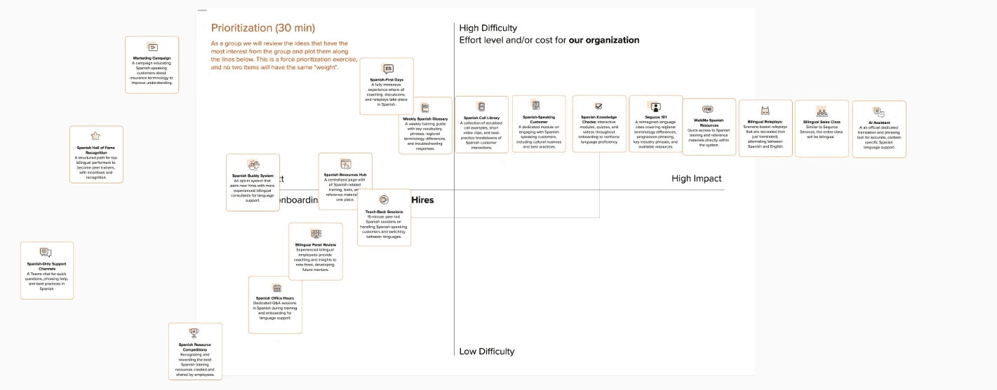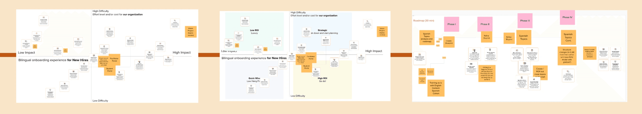 I led a comprehensive visioning project to reimagine the bilingual onboarding experience. Conducting research with 45+ stakeholders and new hires, I uncovered systemic issues in how we prepared Spanish-speaking consultants to serve Spanish-speaking customers. I facilitated cross-functional workshops to co-create solutions, developed a phased implementation roadmap, and secured executive approval for a multi-year transformation.